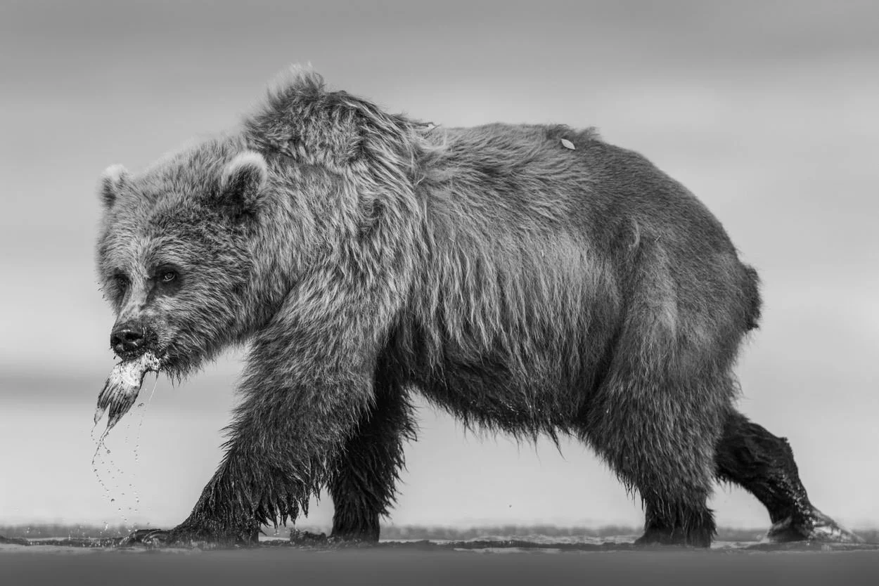 The salmon had yet to run but this individual coastal brown bear got lucky where a creek met the sea. Very quickly his fish of the day was demolished, with just the fishtail remaining as he sauntered off. I captured this mammal behaviour from a low angle to connect at eye level and to show this moulting bear in motion.