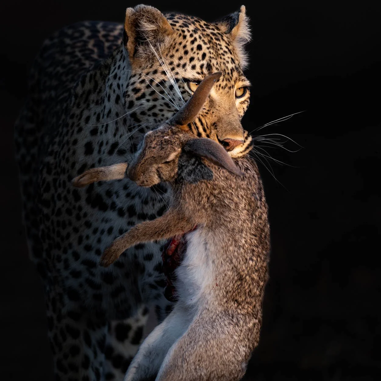 I had been waiting a week for the opportunity to see a leopard walking on the tracks in Sabi Sands, when at last a leopard was spotted in the late afternoon. As our game vehicle approached to assess the evolving encounter, we positioned ourselves near a drainage channel to where we anticipated her to walk towards. This is Nkuwa and this is her territory. I set up for a low angle shot of her inbound approach from afar, only to see as she came into view that she also had a kill in her mouth. A scrub hare. As she continued into the drainage channel as planned, I managed to capture her side lit with her kill, and a glint in her eye. Although the hare was not for her, it was dinner for her growing 7 month year old male cub..