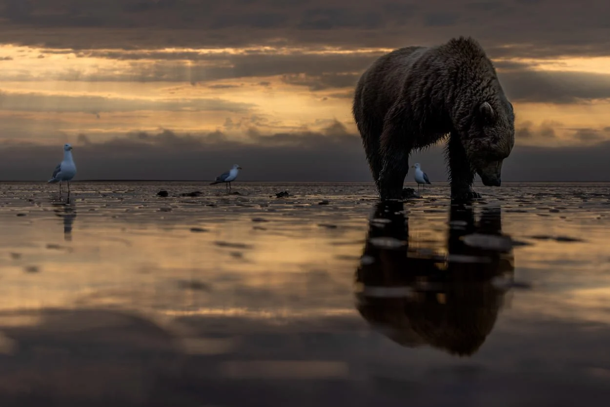 A beautiful dawn with golden light and dramatic skies, reflections in the mud flats of Lake Clark National Park and Preserve. Where there are coastal brown bears digging for razor clams, you will often find gulls in close proximity. The gulls eagerly follow the bears for the scraps in the discarded razor clams. Some may view the presence of gulls as annoying photo bombers, but I wanted to incorporate the relationship between the two species and reflect reality of the bear's environment in my image, which in this case was an entourage of three gulls.