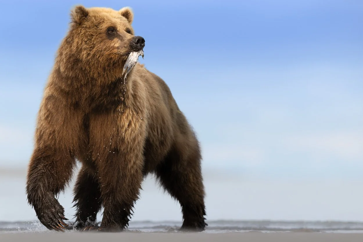 The salmon had yet to run but this coastal brown bear got lucky where a creek met the sea. Very quickly his fish of the day was demolished, with just the fish tail remaining. As he began to walk away, he smelt something on the wind, another bear perhaps. As his nostrils flared he looked into the distance, priming himself to stand to be sure of any competition in the area. Having my camera as low as possible allowed me to capture the power of the bear up close in beautiful light against a soft blue sky.