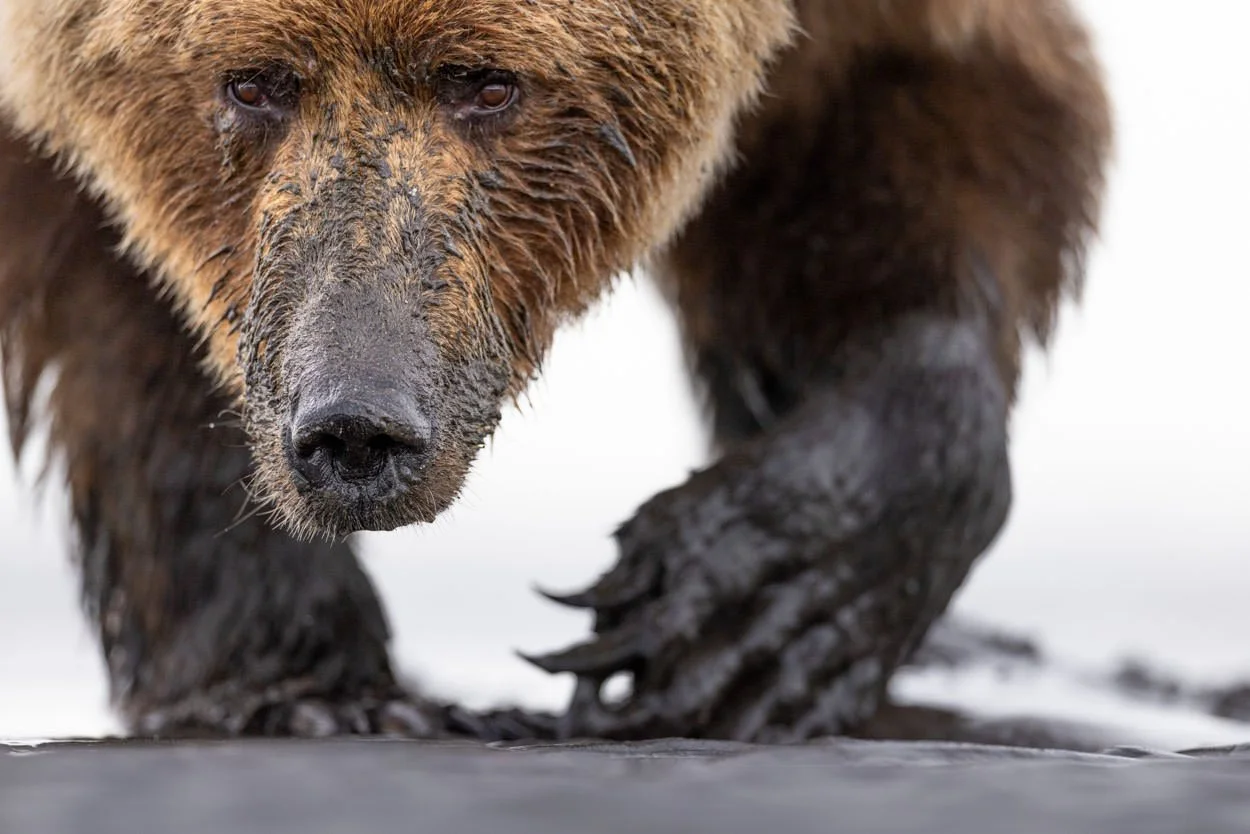 It's not often you have the opportunity to get eye to eye with a brown bear. With an inquisitive stare and powerful paws, half covered in mud, this close up from an inbound brown coastal bear makes for a formidable portrait. At low tide on the the mud flats of the Cook Inlet, these brown bears dig deep for nutritious clams, with their huge shovel like paws and claws, becoming smothered in viscous mud and sand. Sitting on the mud flats, I held my camera low just a centimetre or two off the surface in order to get this low, eye level angle. As the bear approached, I committed to shooting with my long lens to capture as much detail as possible in a tighter composition.