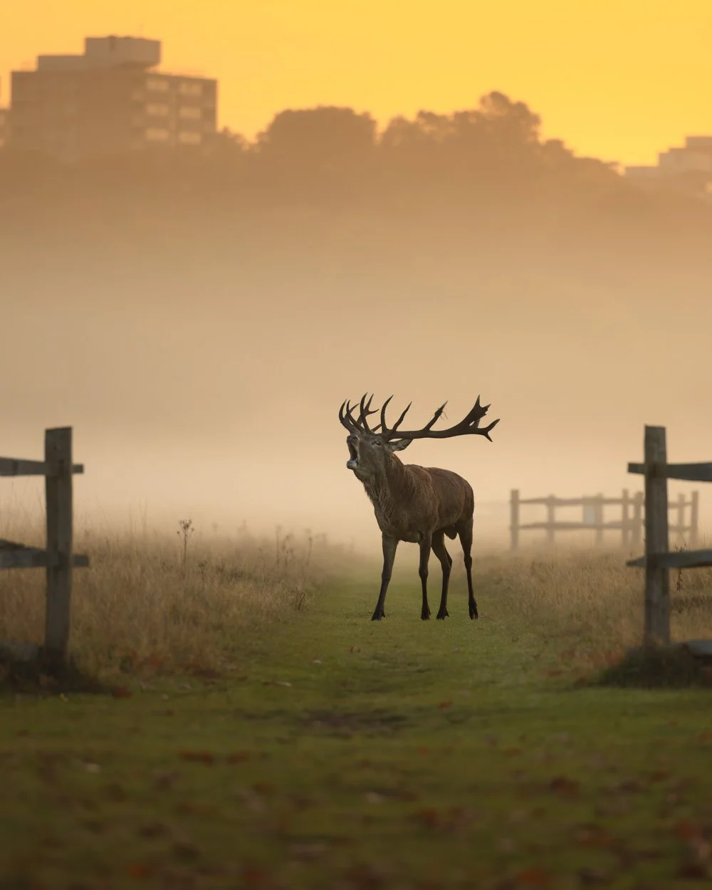 October is a frantic and exhausting time for the red deer that have roamed freely in Richmond Park since 1637. It is the mating season and the stags are full of testosterone which makes them extremely aggressive to any male rivals after their many hinds. I had arrived before dawn to a cacophony of barking and roaring stags in full rut as they try and keep their hinds from straying and away from any young male challengers. This agitated male was pacing back and forth to his small group of hinds to follow him across a drainage channel after several efforts to herd them over. I saw an opportunity that if he stopped in the the meadow path, he would be perfectly framed by fence posts with dreamy meadow mist against a golden sky and outline of the residential flats. I quickly dropped to the ground to capture the leading lines of the path and golden background as he roared to his small harem of hinds.